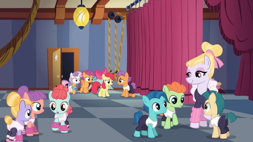 And now comes the part where Apple Bloom organically encounters a cutie mark problem. Desperate for things to do, she hears a dancing teacher with a Russian accent, complete with omission of words like “a” and “the” plus some stereotypical Russian seriousness, and she eagerly joins in.