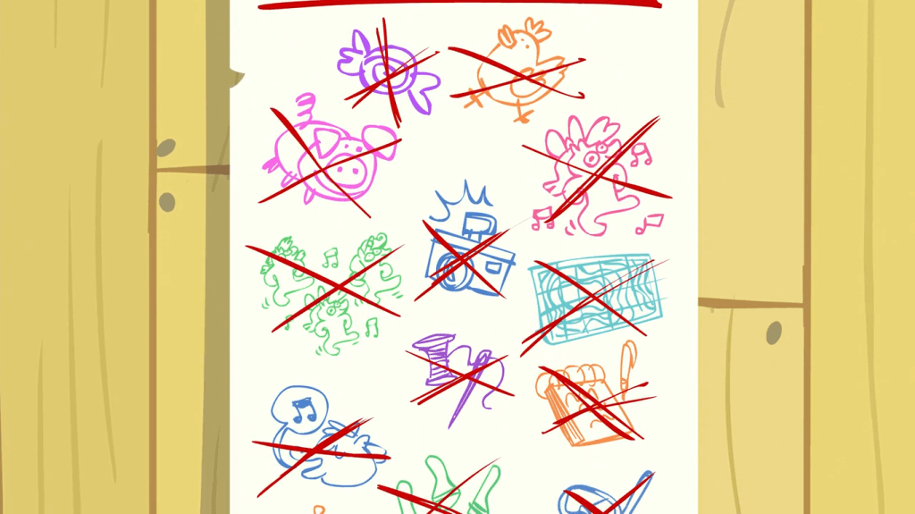 Many of the Cutie Mark Crusaders’ episodes have offhand hints, typically shown in crossed-out drawings, about what activities they tried to earn their marks in. But the board here consists mostly, if not entirely, of things they did onscreen like bowling, snorkeling, writing news, climbing mountains… the list goes on. They realize that pretty much everything they’ve done together was for the sake of earning their marks.