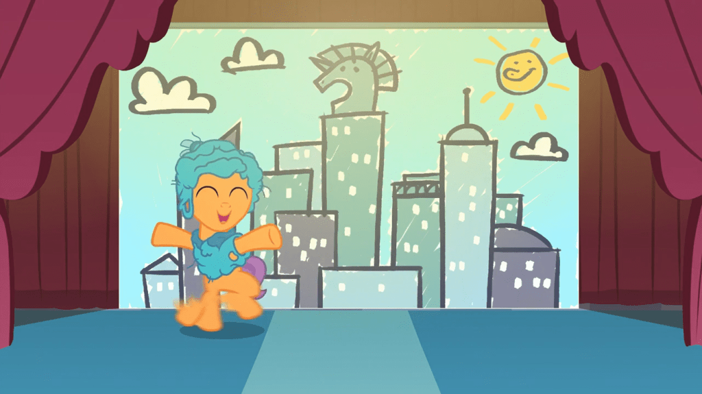 The resolution of this episode has multiple takeaways, both for Tender Taps and Apple Bloom. Tender Taps learned that with a little encouragement, he can overcome stage fright and show an audience what he loves to do. Apple Bloom gained a new interest and a new friend who encourages her to keep practicing it, and she learned that she doesn’t have to do everything solely with her two best friends.