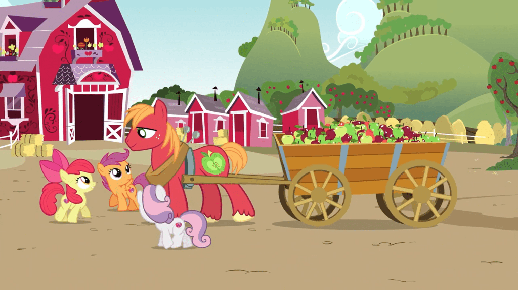 The Cutie Mark Crusaders work at their best when they stumble into a situation organically, but they still don’t know this. That’s a recurring theme in their episodes: if they successfully solve a problem, it’s never what they originally intended to solve. When searching for ponies to help understand their cutie marks, their first idea is Big Macintosh—a favorite target of theirs due to familiarity, much like in Hearts and Hooves Day. All they accomplish when trying to pester Big Mac is get him buried in a pile of apples, so they have to try something else.