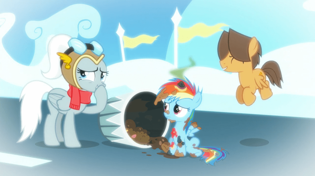 After Rainbow Dash flies more clumsily than the rest, perpetually distracted by her embarrassing nickname, she’s assigned something even more humiliating.