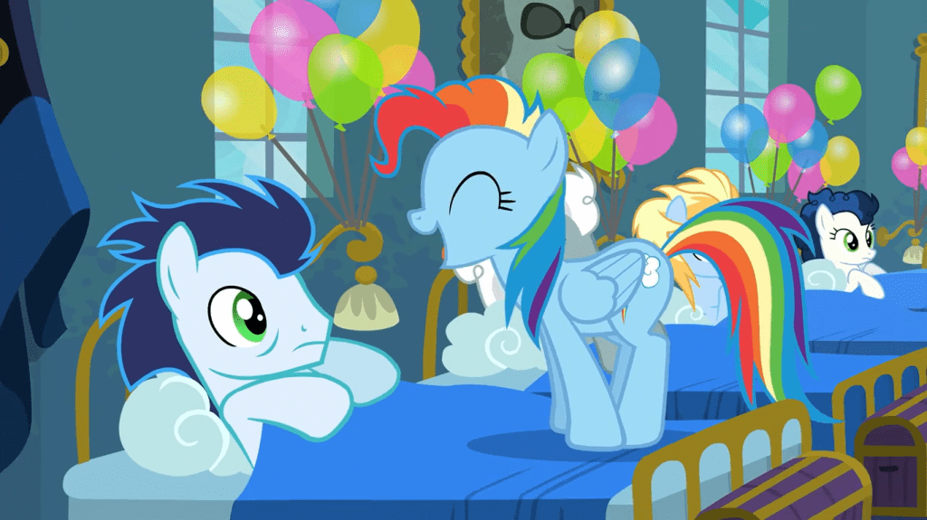 Soarin’ seems like the Wonderbolt who’s most willing to drop the brash act and ask about his friends’ safety, whereas the rest of them think they’re so creative by making the same obvious pun that everyone makes. The sports bullies did it in flight school, Spike did it when Rainbow Dash’s wings got cursed, and Rainbow Dash’s feelings probably were hurt much more than any other Wonderbolt when they got their embarrassing nickname.