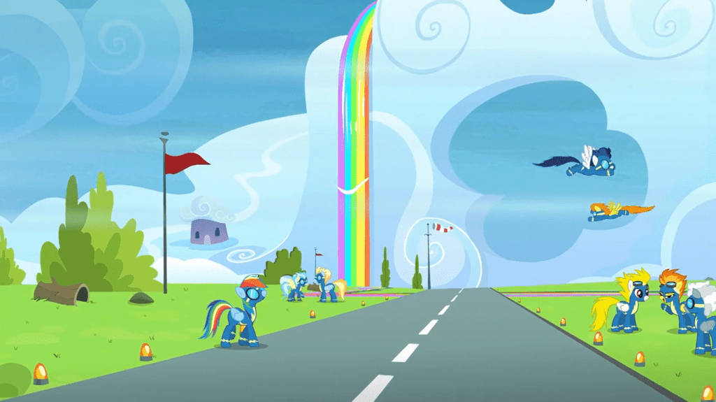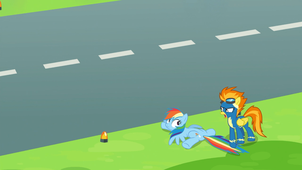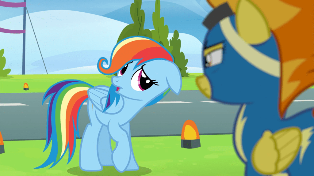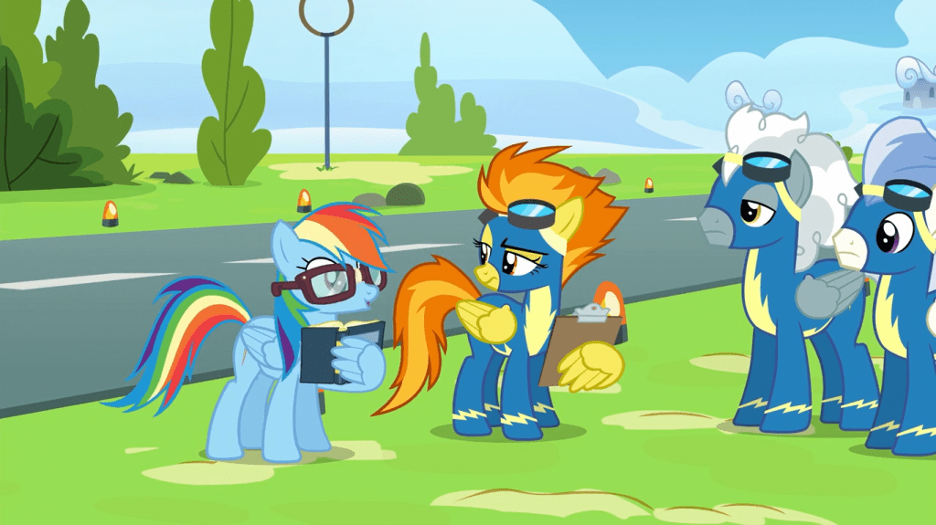 Now here is where things get annoying. Spitfire drills a rule into Rainbow Dash’s head that she must look both ways before crossing the runway, and it feels painfully obvious that Rainbow Dash will forget this rule and get into an embarrassing accident. This is why so many Rainbow Dash episodes are frustrating to me: they decrease her intelligence so that she can make a complete fool of herself and then learn a patronizing lesson from it.
