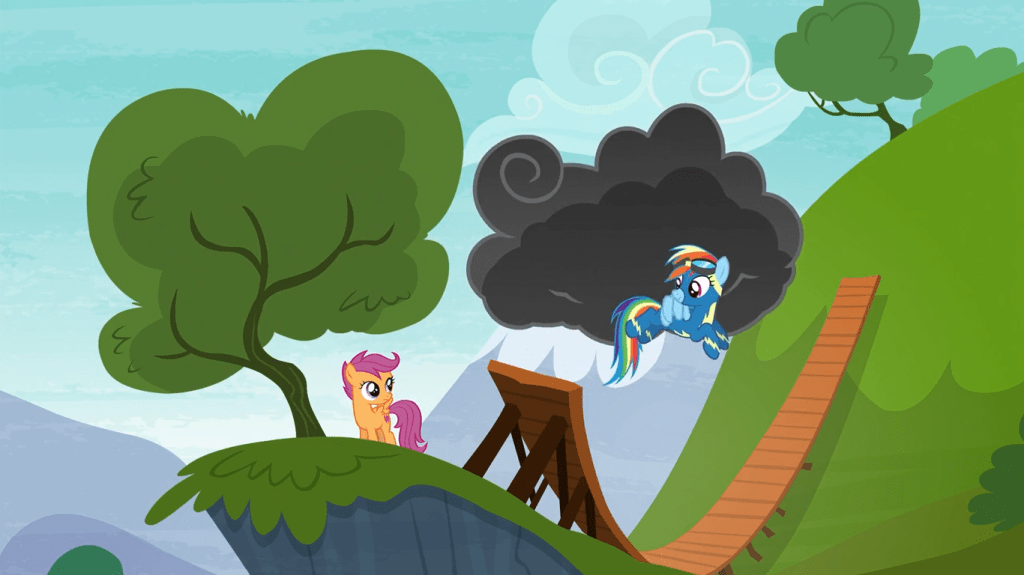 Whenever Rainbow Dash gets ready to embarrass herself, Scootaloo’s presence always rubs some salt in the wound, especially with how uncertain she feels about this idea. Rainbow Dash wants Scootaloo to roll down a ramp and kick a storm cloud so that Rainbow Dash can make an awesome entrance, all because she doesn’t want to be called Rainbow Crash. A little kid getting pushed into her hero and effective big sister’s schemes is just so upsetting to watch, and not in a fun way. This is just so obviously going to fail.