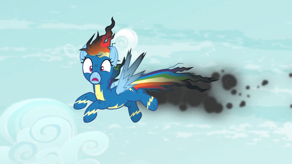 I can’t decide if the Wonderbolts* are more wrong for picking at Rainbow Dash with this nickname, or if Rainbow Dash is more wrong for retaliating so viciously. Regardless of the circumstances that led to this trainwreck, I can’t blame the Wonderbolts for reacting so harshly. Lightning Dust similarly did something incredibly dangerous to boost her good name, and she was evicted without a second chance. It’s actually sweet that they’re letting Rainbow Dash stay.