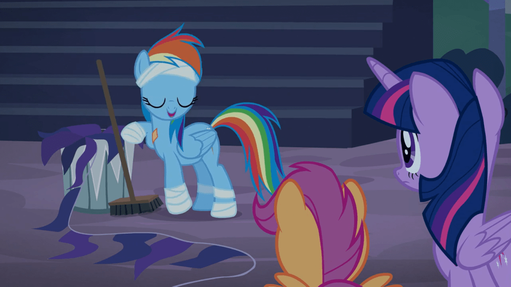 As unfortunate as it is that Rainbow Dash has to clean up a whole building on her first day as a Wonderbolt, this system is kind of smart when you think about it. The Wonderbolts don’t have a janitor, and instead their team members alternate between this position to motivate them to perform better. That’s what’s so frustrating about this episode: though its treatment of Rainbow Dash is painful, a lot of things about it are really well thought out and logical. It’s not like the whole thing is a sloppy mess of contrivances like multiple other Rainbow Dash episodes.