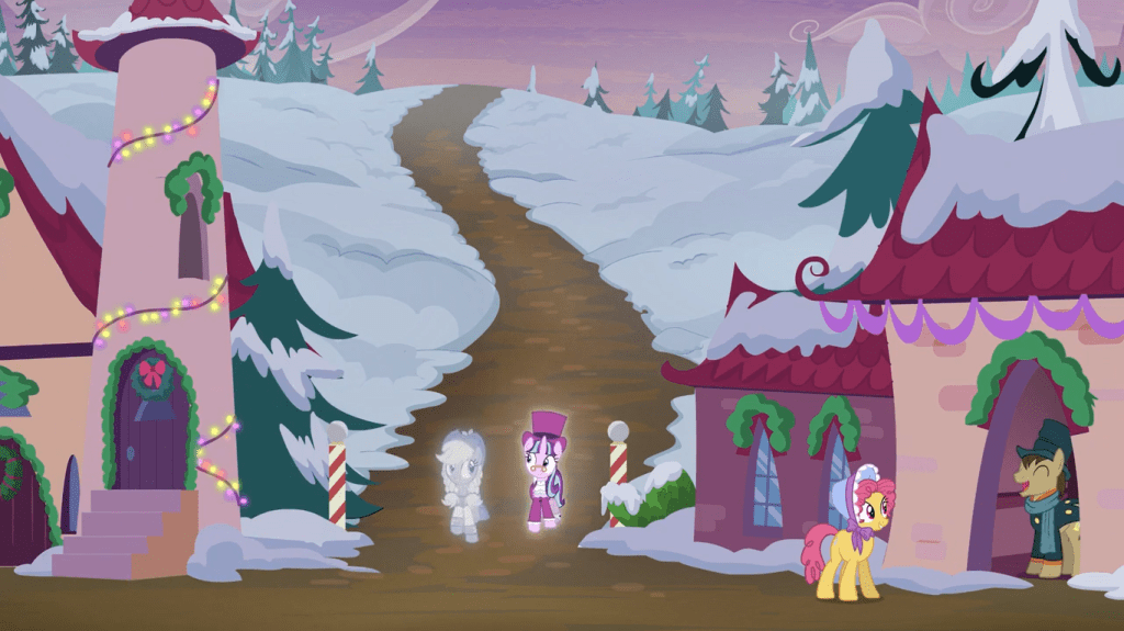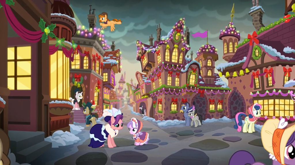 This story takes place in Canterlot and introduces the one pony in the town who didn’t like Hearth’s Warming Eve: Snowfall Frost, the story’s counterpart to Starlight Glimmer. My first observation is that Canterlot looked way different back in the day, which isn’t too hard to believe. It’s common to see a picture of a city from a century or two ago that looks unrecognizable, especially if that city has become increasingly designed around cars, which is a tragedy.