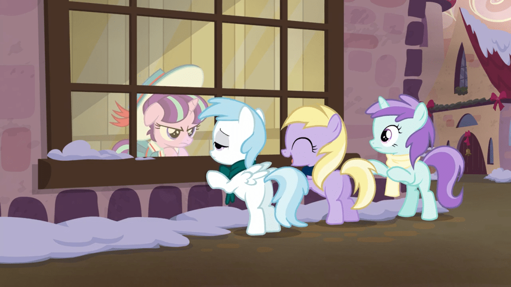 Just like that, Snowfall Frost has a change of heart and joins in on the Hearth’s Warming celebrations with some last-minute gifts, saying the usual “Christmas is about friendship” stuff. It’s a pretty dull and standard resolution to the story, but I guess the episode was short on time after all those wild musical numbers.