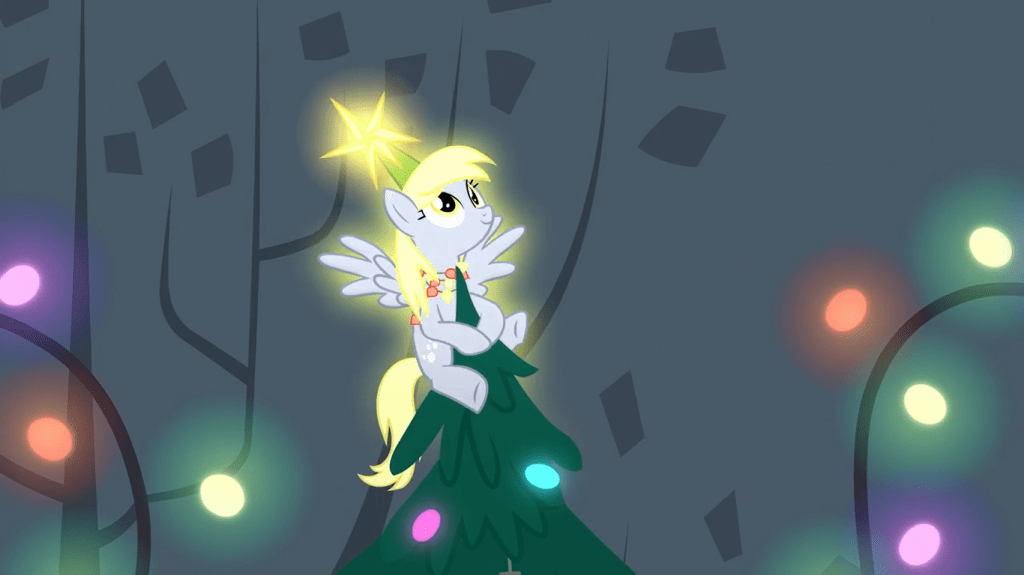 The moment the holiday lights are all turned on, Derpy herself starts glowing at the top of the tree. It might not make logical sense that Derpy would start glowing, but it makes a ton of thematic sense. Derpy is the shining light of the show, representing the vibrant fanbase that turned the show into such a gigantic cultural phenomenon and smashing success. She’s watching over all the other smaller, less important ponies as they sing one of their silly little songs.