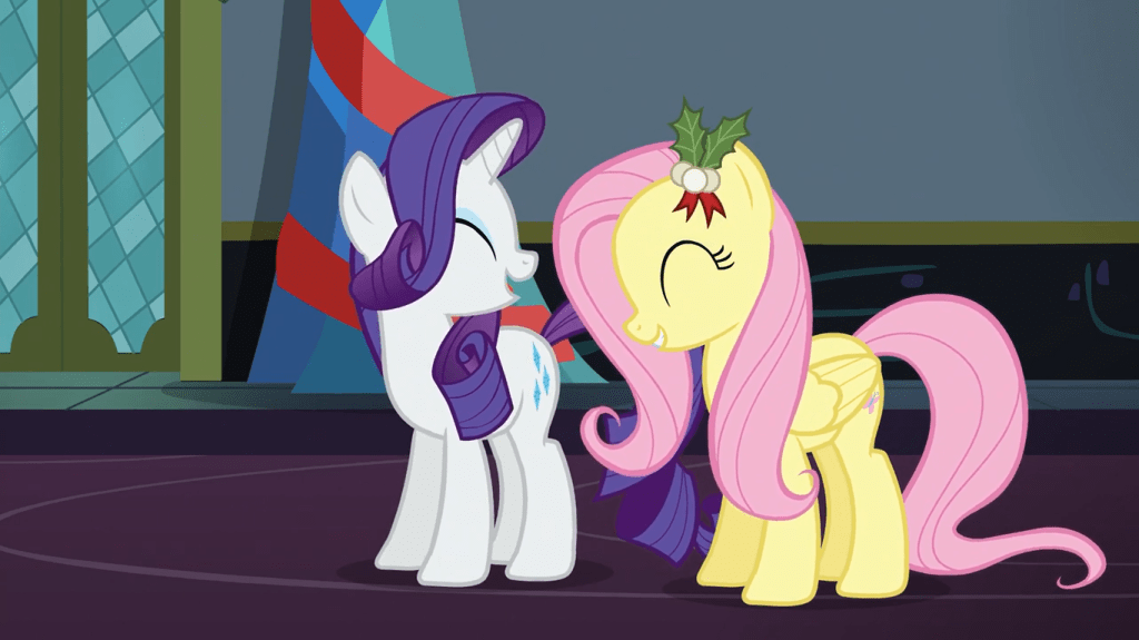 During the chorus of the song, Rarity puts a piece of mistletoe in Fluttershy’s mane, which is some possible ship tease that seems very random. Random in the context of this episode, that is. As far as pairings between Mane 6 members go, Rarity and Fluttershy are among the most commonly seen together. They’re the two most artistic members of the group and share interests in singing and sewing, and they often go to the spa together, so I can see why they’d be teased here.