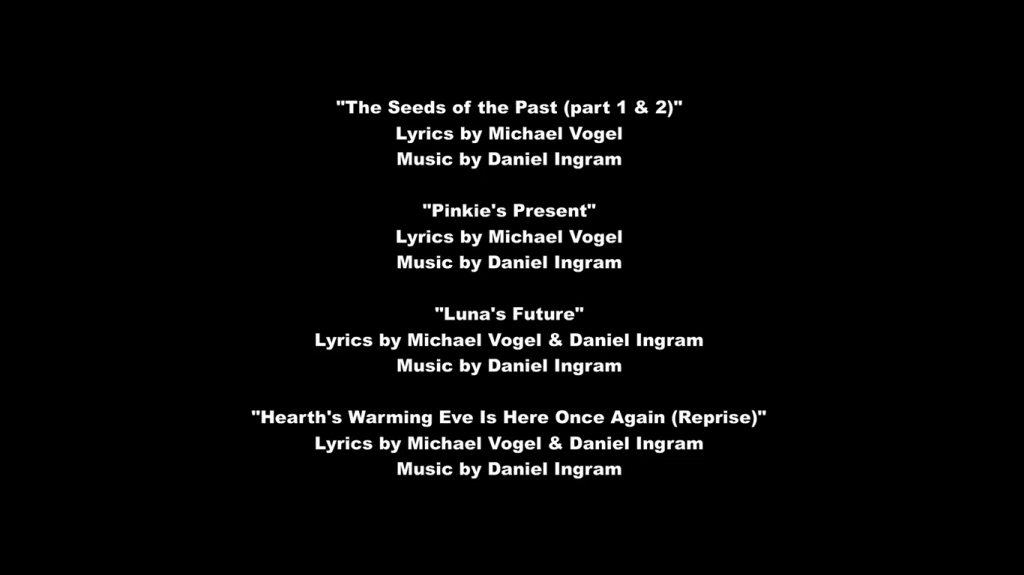 This guided flashback is told through a two-part song called The Seeds of the Past, which is interspersed with a brief speaking scene. The song blends Applejack’s country music with the show’s more typical expository song style to nice effect.