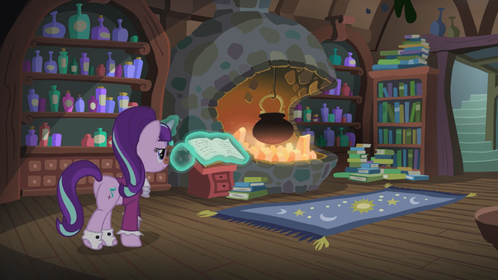 Starlight Glimmer continues being skeptical, and Twilight Sparkle responds by offering to tell a Hearth’s Warming story that she and Spike both enjoy, which I want to say is called A Hearth’s Warming Tale, even though this episode is called A Hearth’s Warming Tail. Maybe it’s a matter of dispute in-universe what that story should be referred to. Anyway, it may seem odd that “A Hearth’s Warming Tale” refers to a specific work of media in this show, but it’s less unusual when you remember that “A Christmas Story” in real life refers to an 80’s movie with a plot involving a BB gun and a whole bunch of other stuff.