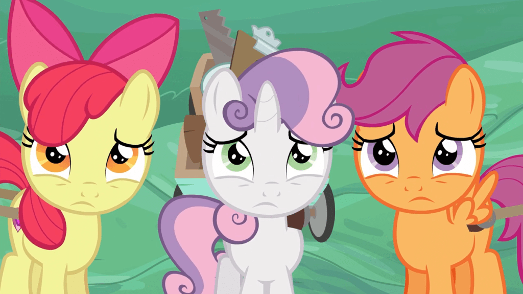 Can Applejack, Rarity, and Rainbow Dash not see how unhappy the Cutie Mark Crusaders look? They’re doing the annoying thing that some episodes do, where multiple characters who normally have distinct unique personalities all smugly agree to put others through a bunch of painful suffering.