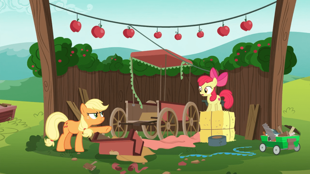 Now we get to the recurring problem with Cutie Mark Crusaders episodes: the adult characters’ intelligence has to decrease in order to drive the plot. Applejack is the most common victim of this pattern, but all the Mane 6 can become infuriatingly stubborn and unwilling to listen to reason when the Crusaders are an episode’s focus. Applejack’s attitude towards Apple Bloom is harder to justify because unlike Rainbow Dash, she’s known her corresponding Crusader all her life and should know Apple Bloom likes to invent new things rather than stick to Apple family traditions.