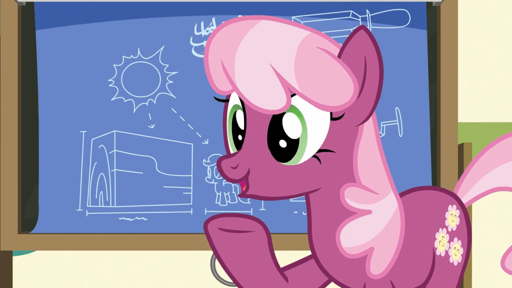 I’m further convinced the math formulas were a joke when Cheerilee puts a much simpler blueprint over the chalkboard. Each of the foals in her class will be provided a block of apple wood that they have to make a cart out of in one day, and they can each choose an older pony to help them—the Crusaders all know who they’ll pick. There are three different awards for the race: fastest, most traditional, and most creative. It seems obvious which of the Crusaders would want to win each prize… right?