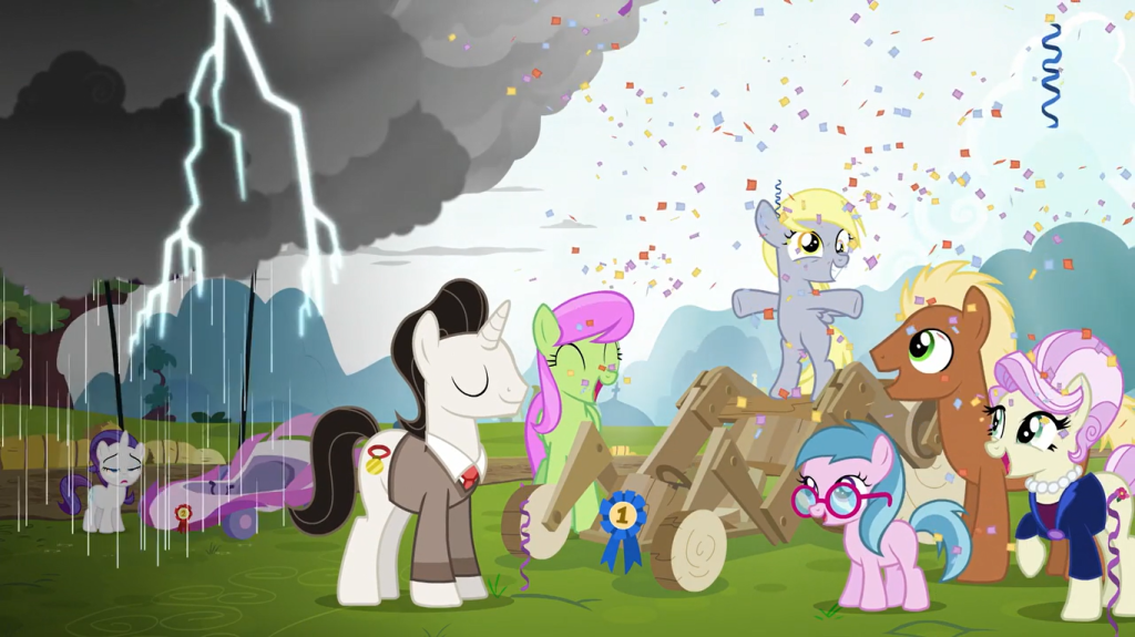 As we can see on the left side of this image, Derpy Hooves is the champ of this episode, and Applejack, Rarity, and Rainbow Dash should all strive to be like her. She and another colt worked together to make a cart that mixes Derpy’s style with a more typical cart style, and as shown by their joyed expressions, it looks like they evenly shared the work. I think everyone should strive to be more like Derpy. She’s clumsy and messes up sometimes, but she always tries her best and everyone loves her. The number 1 on her cart clearly indicates that to fans, she is always number one.