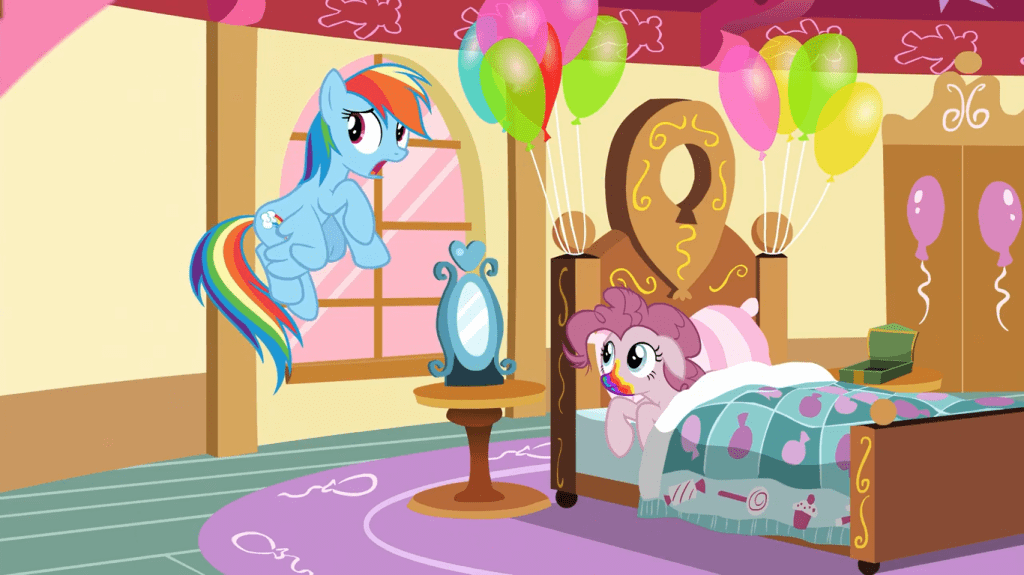 The others ask Pinkie Pie if she could help get Rainbow Dash to stop, and she’s visibly conflicted about it.