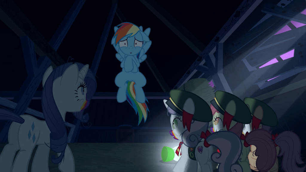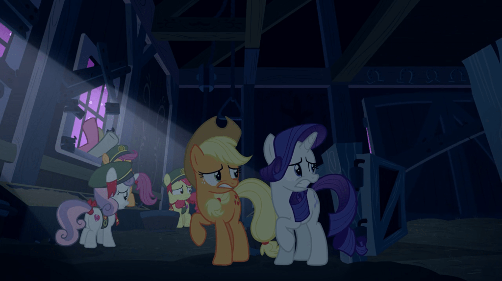 Applejack, Rarity, and the Crusaders join Rainbow Dash and lock themselves in a barn, and they do way too good of a job pretending to be scared. I thought Applejack was supposed to be bad at lying! Being the element of honesty doesn’t mean she never lies, but rather that when she lies, it’s begrudging and doesn’t sound convincing. The only explanation is that she rehearsed these lies for hours nonstop until she got the tone right.