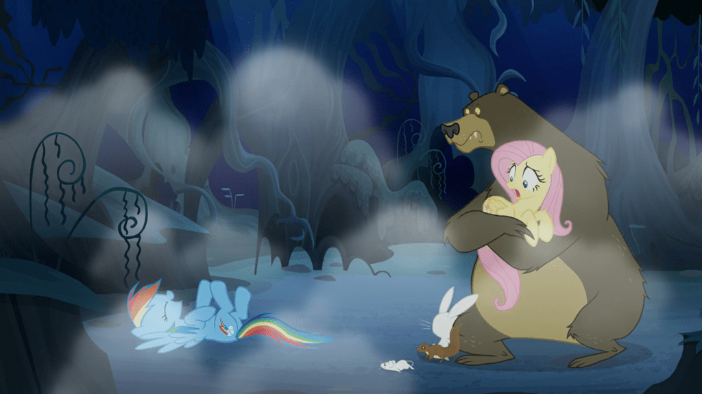 Fluttershy is participating in this prank too and got her animals to play along, which is weird because she isn’t known for responding to cruelty by being cruel in return. Plus, last time Fluttershy used her animals to scare all her friends, she didn’t enjoy it and only did it because her friends wanted her to get out of her comfort zone. This is the recurring problem with Rainbow Dash episodes: in many of them, all other characters are smoothened to be equally mean and patronizing to her.