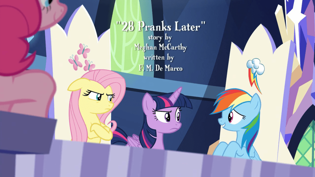 You could argue that Rainbow Dash’s statement that she needs to pull an even bigger prank was her even bigger prank. Everyone seemed to fall for it, and I guess this ending is supposed to be the kind of prank that’s OK to pull? Probably? The episode ends with dissonant, apocalyptic sounding credits music that represents how horrified I feel that I’m not done writing this episode review, because I have to write the…