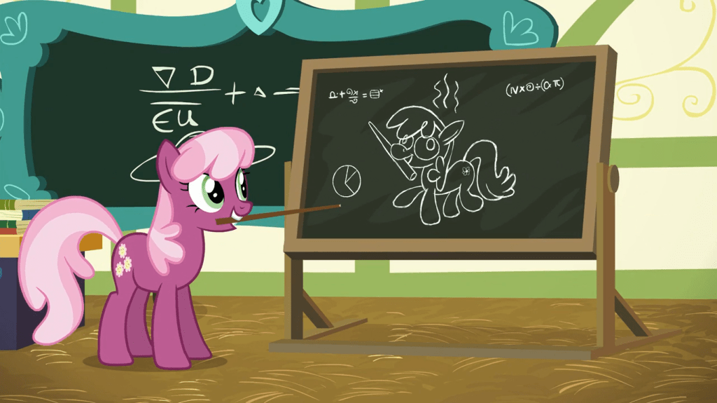 The class is very confused when Cheerilee tells them they’re going to learn advanced physics. Then when she says it’s going to be for this year’s Applewood Derby, they all cheer in excitement. I bet Cheerilee wrote a whole bunch of advanced math formulas on the chalkboard just as a prank to the class, so she could see their relieved and delighted faces when they learn about the derby.