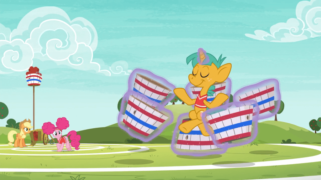 It might look like Snails was sleeping through most of the practice session as Pinkie Pie and Fluttershy scored a streak of points, but when a ball comes near him, he wakes up just fine and catches it. I think Snails has the rare superpower of deciding when to fall asleep and wake up. This is a result of his ability to think about nothing, because when you’re tired enough and stop thinking about anything, you fall asleep. Perhaps when Snails is older, he could work as a doctor treating insomnia.