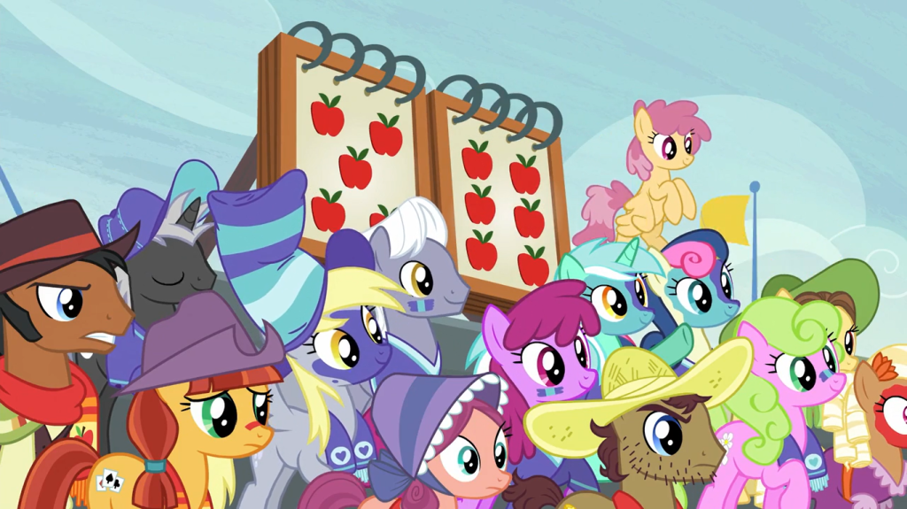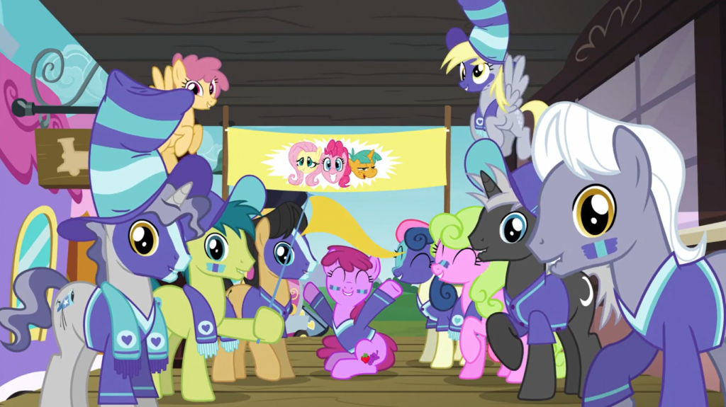 The Cutie Mark Crusaders walk around Ponyville and see various ponies they’ve helped with their cutie marks, some familiar, some new like Blue Note. I love the little music theory reference on his cutie mark: a blue note in jazz music is a note played at a slightly lower pitch than standard, indicated by the flat sign. It was probably Sweetie Belle who realized this, since she knows how sheet music works, but she’s polite enough to let the other two piggyback on her accomplishment.