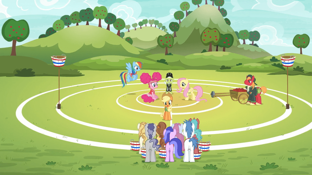Applejack, with the help of some of her family, demonstrates how buckball works. It’s a cleverly designed sport that combines the abilities of earth ponies, pegasi, and unicorns without creating bias to one specific type. The game is supposedly an Apple family favorite, but since her family consists mostly of earth ponies, I imagine they have to get tons of guests on board.