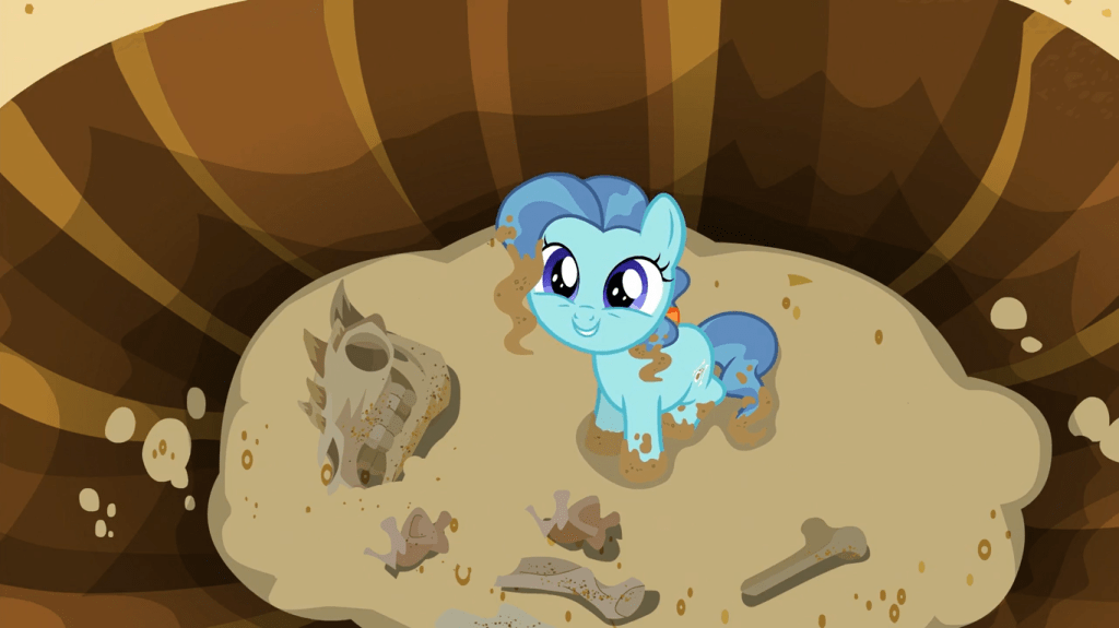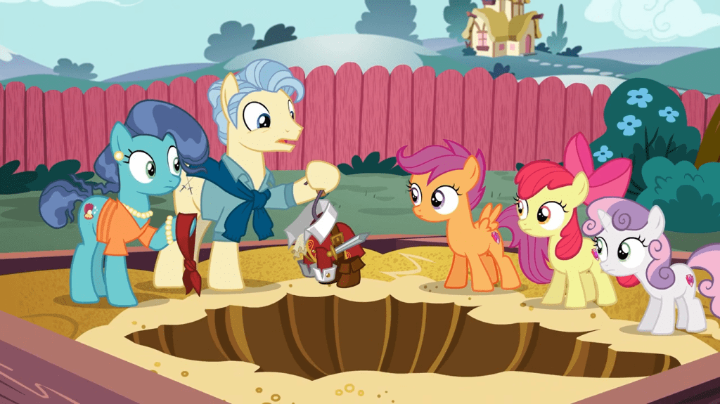 This episode begins with a scene that portrays the Cutie Mark Crusaders as child prodigies, which furthers my theory that Diamond Tiara and Silver Spoon stopped talking to them because they now think they’re beneath the Crusaders. Normally, if a married couple wants to consult someone about their child’s strange behavior, they’d go to a professional adult, but the Cutie Mark Crusaders are so renowned in Ponyville that the parents will happily discuss their problem with these three foals. Their child Petunia has a concerning skull and crossbones as a cutie mark—funny coming from a father whose cutie mark is two swords—but it turns out that her specialty is archaeology. If the Crusaders understand more about cutie marks than most adults do, then I can only imagine what ambitious things they’ll accomplish as adults.