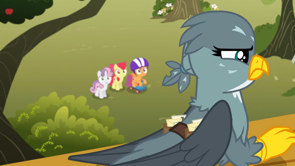 This is very sweet of Gabby, and it shows her opinion on the Cutie Mark Crusaders is more than just ludicrous idolization. She genuinely admires how much they go out of their way to help others, and it’s inspired her to do the same. She made the sacrifice of leaving the Crusaders’ lives so that they don’t feel let down by her, or at least trying to leave, because the Crusaders had just discovered her.