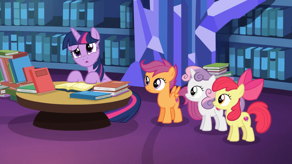 Twilight Sparkle: Crusaders, I’m sorry. While I can’t say for certain that it’s utterly impossible, the chances of Gabby getting an actual mark are… pretty slim. Everything I’ve ever learned tells me. It’s just not gonna happen.