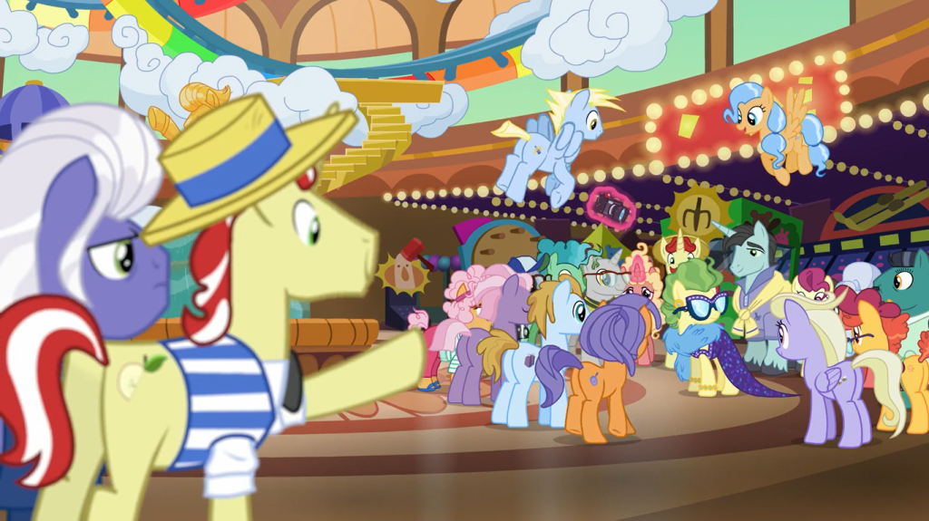 Pinkie Pie is the absolute last pony who the map should send to Las Pegasus. She would see a bunch of bright colors and party games and immediately forget why she came here unless someone kept a VERY close eye on her. As for Rainbow Dash, it’s not very polite of Fluttershy to spoil the premise of Grannies Gone Wild.