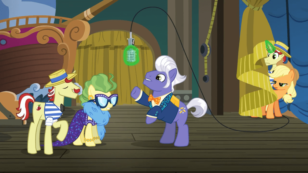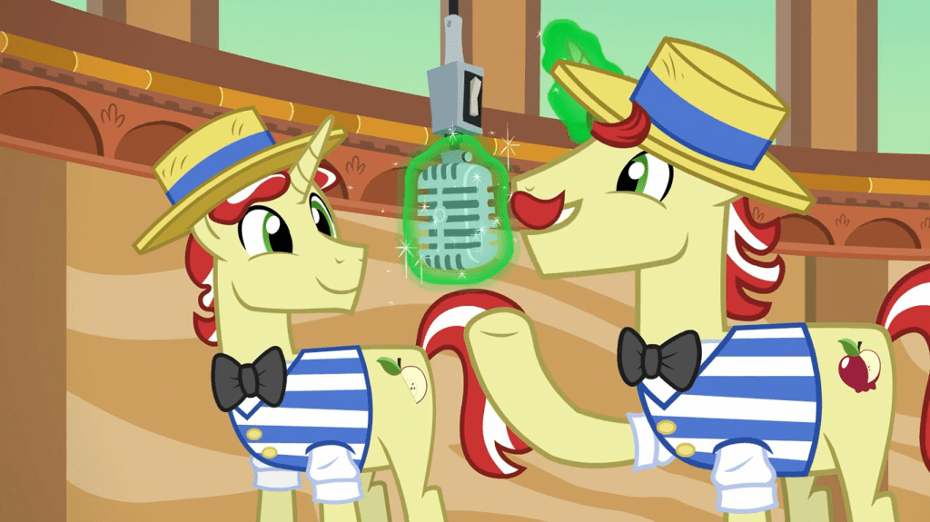The other pair of ponies reveals the same thing to Applejack. They used to perform together, but since they started working at Gladmane’s hotel, they’ve argued over everything, and it’s halted their career. Applejack is picking up on a pattern now.
