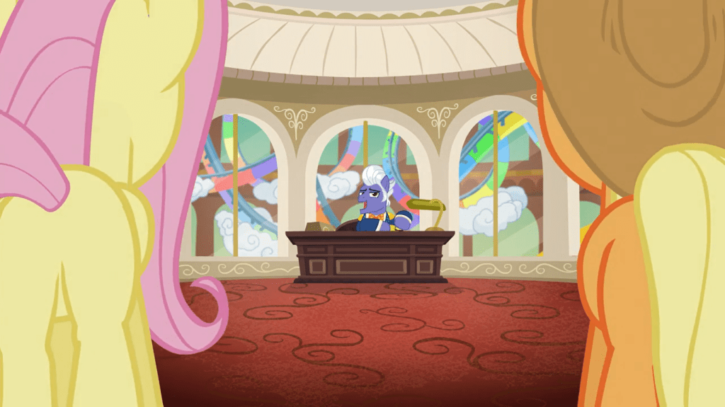 The Flim Flam brothers disguise Fluttershy as the grand-matriarch* of the Rich family, Impossibly Rich. It’s not clear whether there is a real Impossibly Rich, but given that the brothers made up everything about her story, I think they made up her existence too. And yes, this would mean she’s the Flim Flam brother’s OC. Flim tells Gladmane that Impossibly Rich wants to purchase the hotel while keeping up the act that he and Flam are rivals. Flam explains “Impossibly Rich’s” whispering to him by saying she wants a tour of the hotel in an hour, and Gladmane accepts it.