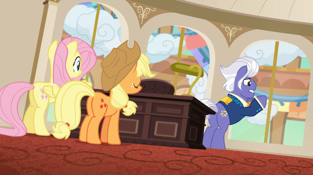 Applejack discovers the previously seen magic performer ponies getting into a nasty argument, and another guy says that if these two stopped arguing, they could to go on tour beyond just Gladmane’s hotel. Applejack remarks that this sounds like a real friendship problem, which is a humorous double standard. To her, a petty dispute is a bad thing if it’s between ponies she doesn’t know, but not if they’re her arch-nemesis. (Can two people be one person’s arch-nemesis? Since this is my blog, I will say yes.)