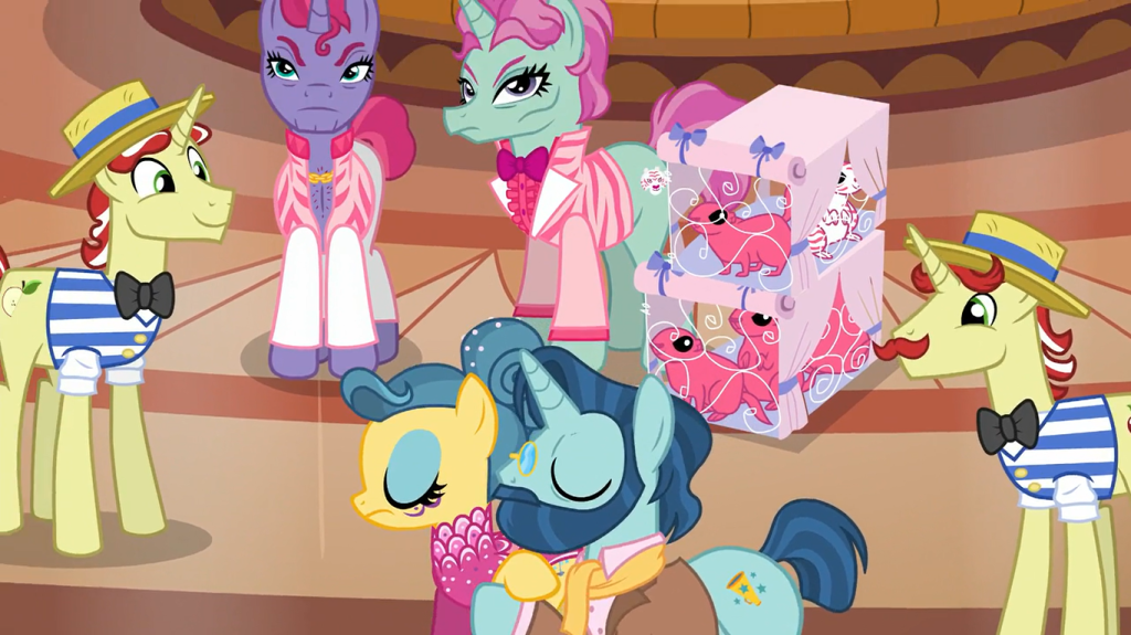 And just like that, Flim and Flam announce they’ve taken over the hotel and have returned to their sleazy schemes, much to Applejack’s chagrin. This makes for the show’s first ever episode where a villain wins in the end—the only other ones I can think of are in season 9 with its villain team. Despite this, Applejack and Fluttershy’s cutie marks flash before this scene, showing that the Cutie Map considers it far preferable for Flim and Flam to own the hotel than for Gladmane to. It’s kind of awesome that the Flim Flam brothers ended their third episode successfully tricking Applejack. It was their plan all along to take over the hotel, and Applejack and Fluttershy merely helped with that. Luckily, the other pairs of performers, whose lives were affected the worst, have moved on to perform elsewhere.