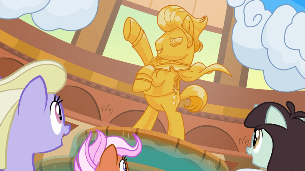 We meet Gladmane in person soon enough, and despite his humble exterior and claims that he thinks of everyone in the hotel as his friends, he already shows red flags of being the episode’s villain. His appearance is plastered onto the doors, he has a huge statue in the center, and he plans to make the hotel even bigger. The statue in particular is a massive sign of egotism. Compare the example of a benevolent leader, like Celestia—she has a stone statue in Ponyville, but none in Canterlot to my recollection.