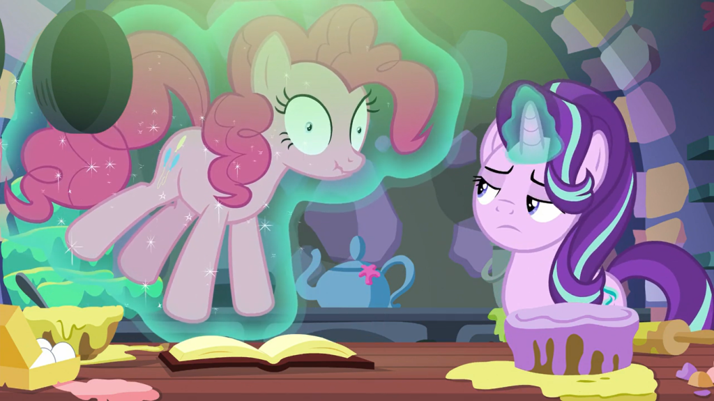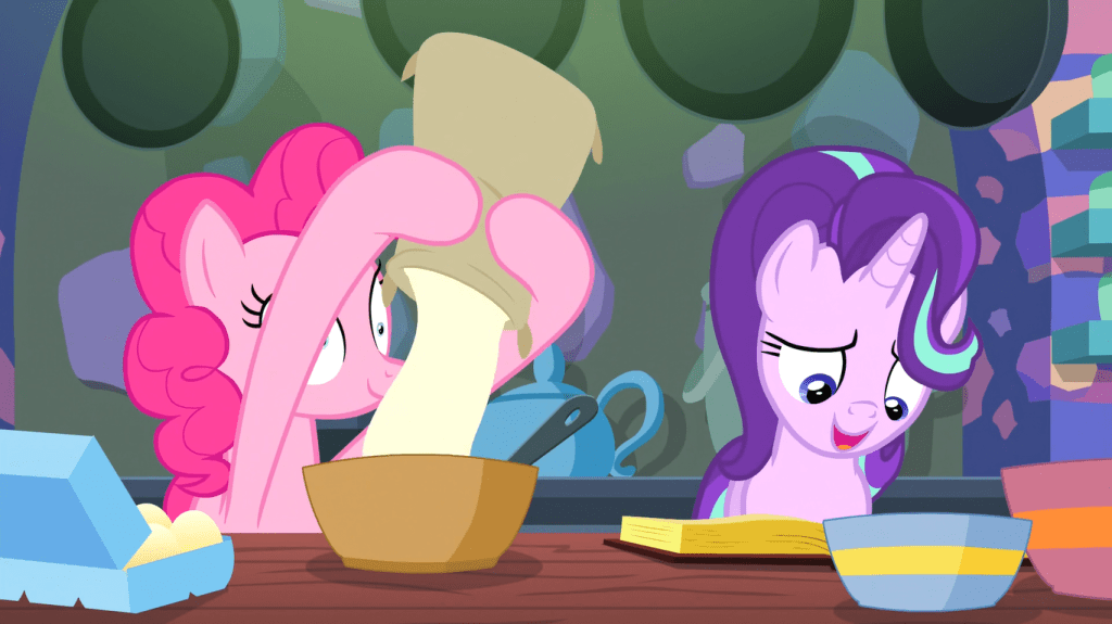 Pinkie Pie follows Starlight Glimmer’s baking instructions to the letter with freakish speed. I think she’s normally capable of baking cakes at lightning speed, but she chooses to take her time because it’s more fun, unless it’s an urgent cake emergency.