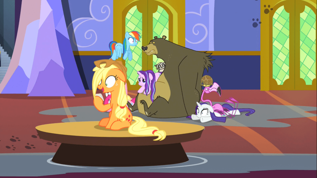 As the fifth friendship mission episode of seasons 5-6, it makes sense that this one is all about toying with expectations. It has an uncommon pair of main characters, an odd location, and a surprising return of villains who almost become reformed. Applejack and Fluttershy are an interesting oddball pairing, and I think they aren’t paired up often because their most prominent dynamics with other Mane 6 members are both with Rainbow Dash. They’re also an unusual pair because honesty and kindness tend to be at odds—you’ll often have to sacrifice one in favor of the other. But this episode makes their pairing work, getting a lot of mileage out of their skills and history.
