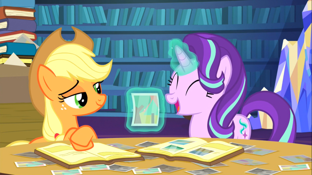 It’s weird that Applejack extensively recounts a whole bunch of different stories from each photo but doesn’t remember how she usually organizes her photos. You could infer that Applejack doesn’t have her own organization system and merely follows what others suggest, and if you assume she’s never organized photos on her own, that’s not hard to believe. Perhaps she usually organizes photos with Granny Smith, and she wants to do it with someone else for a change. She knows that Starlight Glimmer shares Twilight’s knack for organization, so perhaps she was hoping Starlight could help organize these photos in a logical way. Meanwhile, Applejack could share stories from the photos that would help Starlight get to know her better. Unfortunately, Starlight had her own idea.