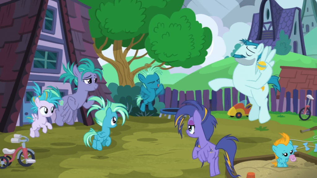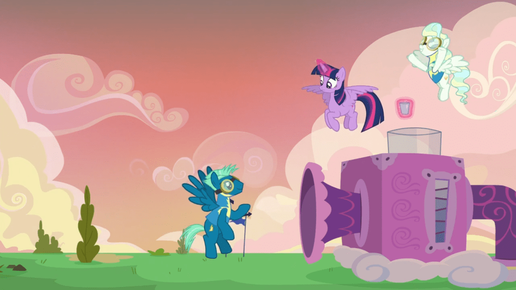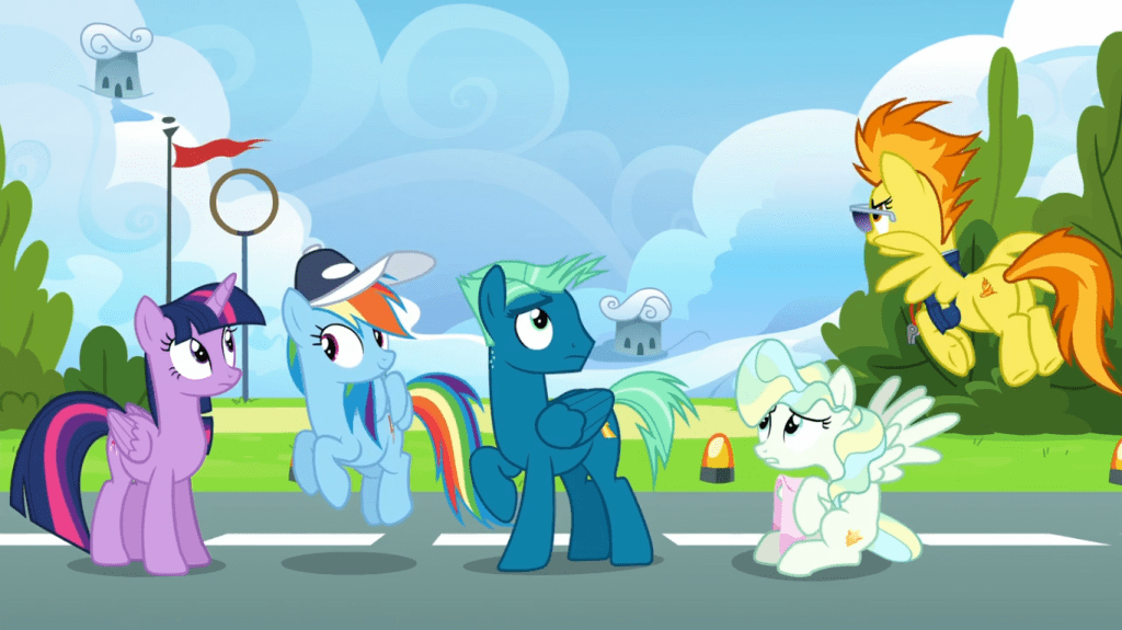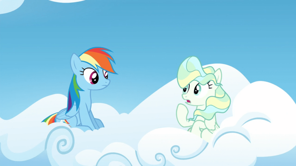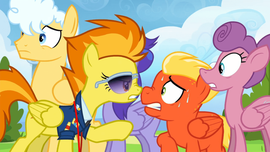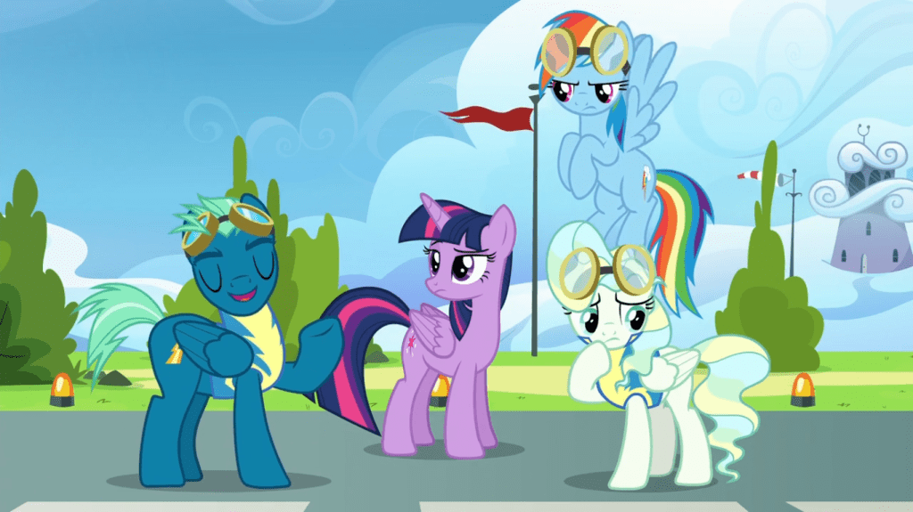 Twilight Sparkle mentors Sky Stinger to help his flying skills, and Rainbow Dash helps Vapor Trail with hers; the trainer who’s had wings her whole life has more success. Vapor Trail learns flying skills quickly, while Sky Stinger remains overconfident and clumsy.
