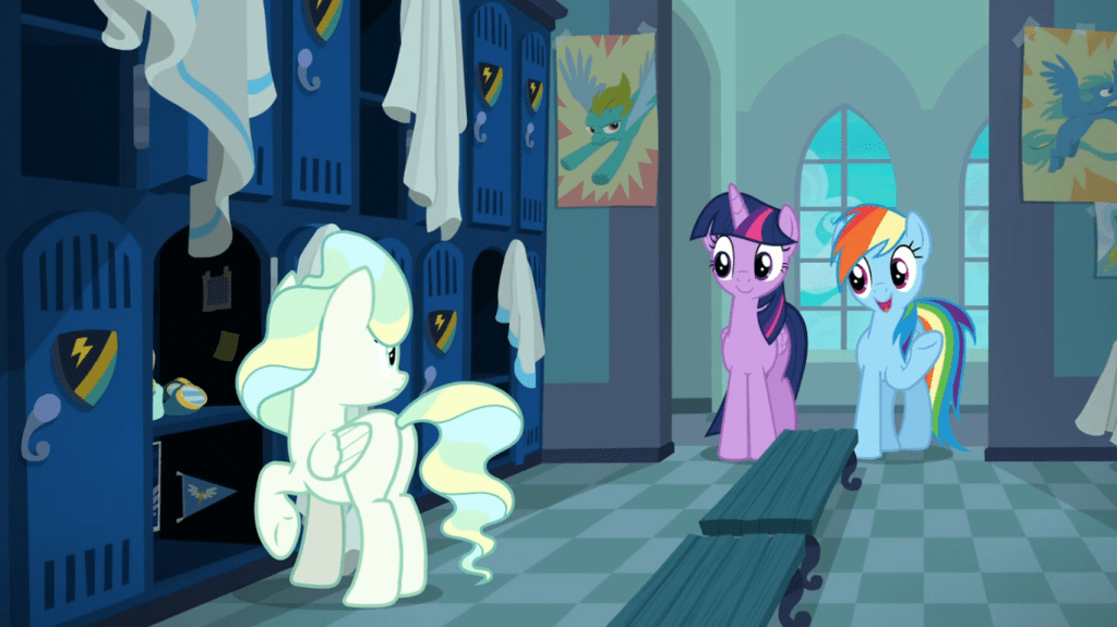 Remember when I said Rainbow Dash’s locker was fifth from the right at the start? Now, we’re back in the same room, and Vapor Trail’s locker is sixth from the right. Does she know her lock is right next to that of the legendary Rainbow Dash? Maybe their names are written in small text on the shield icons… though the more common way to write ponies’ names in this show is to draw their cutie marks.