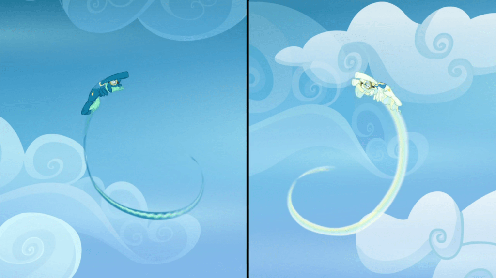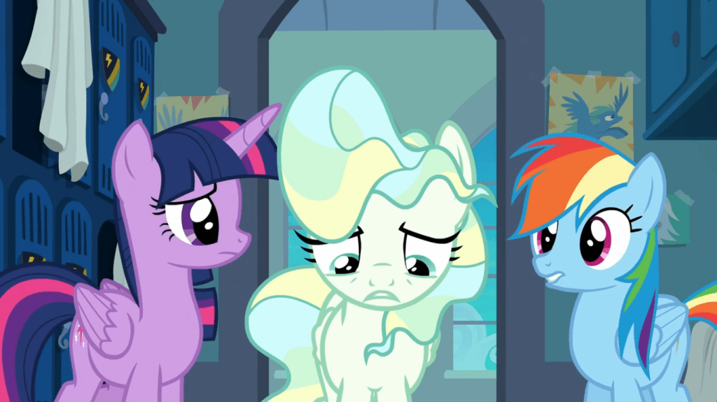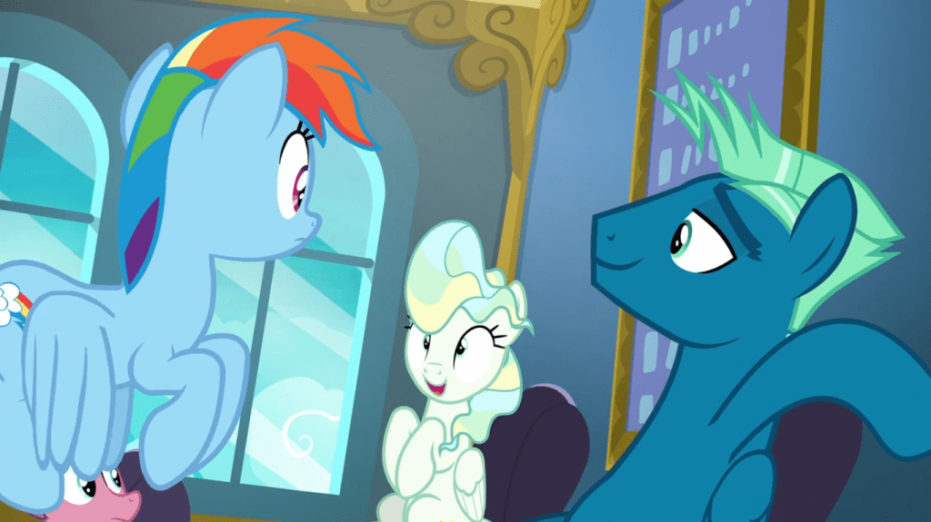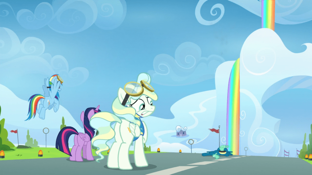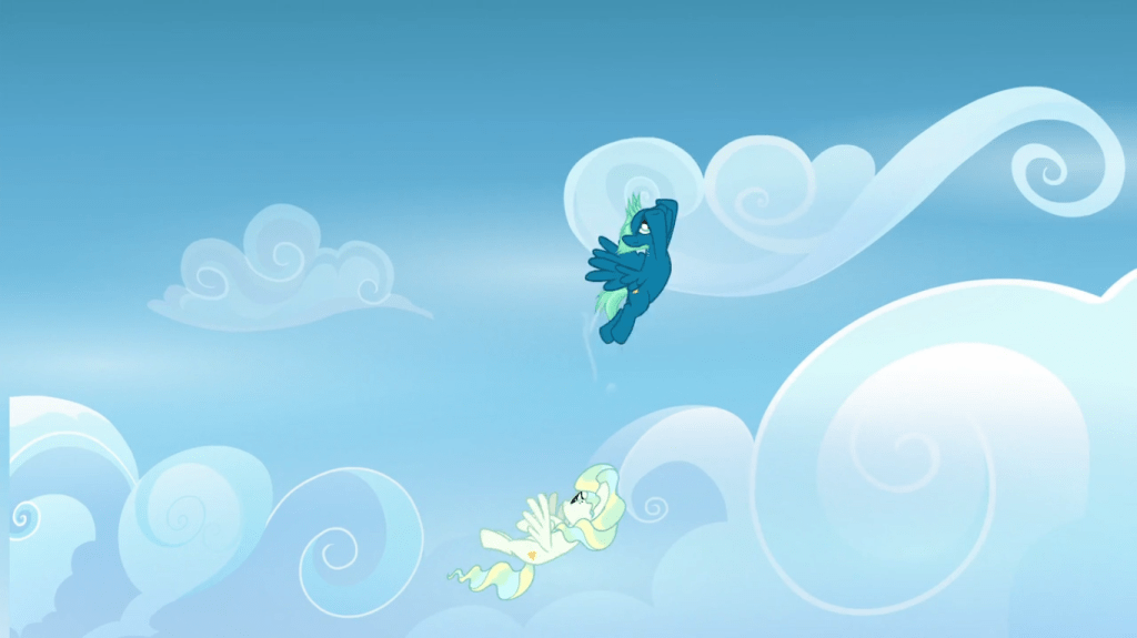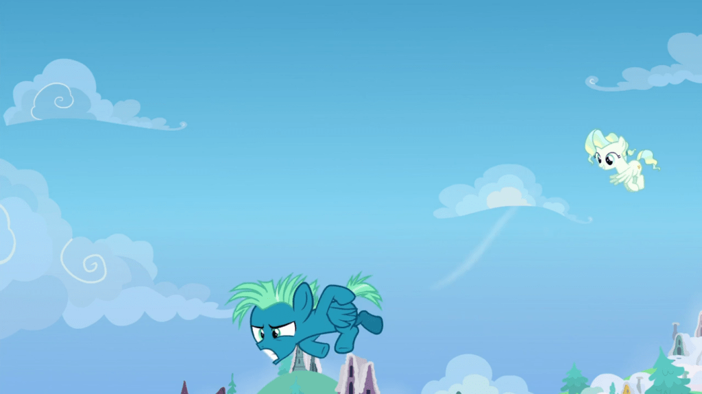 Let’s talk about the writers of this episode. Joanna Lewis and Kristine Songco, the power duo who wrote this and various other episodes mostly in seasons 5-7, have a knack for introducing one-time characters with a surprising amount of depth.* The new ones in this episode are a contrasting pair of wing ponies: a brash and confident boy named Sky Stinger, and a humble and shy girl named Vapor Trail. Rewatching this episode, you can already sense the effects of Vapor Trail upholding her years-long secret: his overconfidence in his flight skills, and her fear that someday the truth will slip.