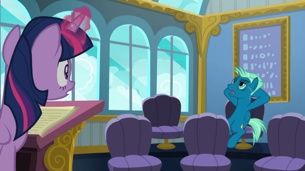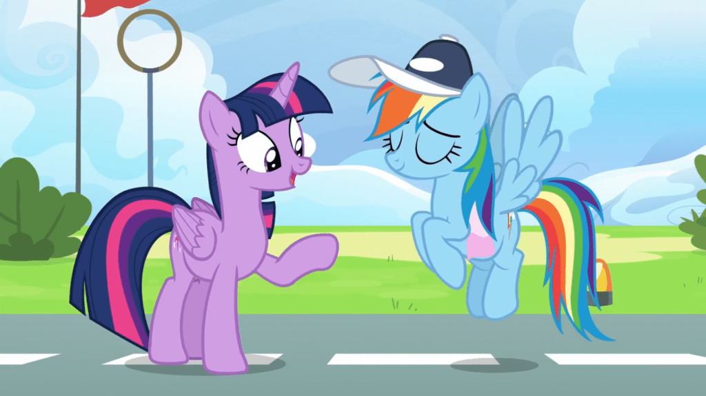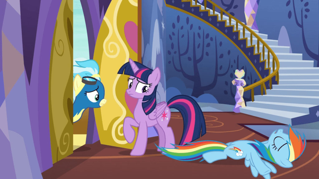 Twilight Sparkle’s bright smile when asking if there’s a friendship problem cracks me up so hard. This scene shows an important trait she and Rainbow Dash share: they’re the most self-absorbed of the Mane 6. Rainbow Dash can’t resist showing off to her mentor-turned-colleague Spitfire, and Twilight Sparkle approaches friendship problems with amusing overconfidence. I’m glad we got a friendship mission episode pairing them up, because their interactions are such a joy to analyze. They’re a dynamic duo consisting of a purple nerdy egghead who loves books, and a blue nerdy egghead who loves books. They rival Applejack and Rarity as my favorite Mane 6 pairing.