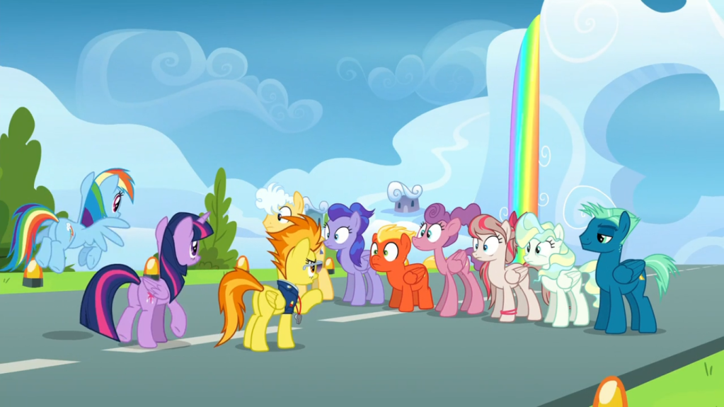 The start of this episode is a clever bait-and-switch. As she prepares to go back home, Rainbow Dash banters with her fellow Wonderbolts. Spitfire grumbles that she has to run trials week, then admits she loves putting on her aggressive act. This seems like it’ll just be a quick reminder that Rainbow Dash has fully established herself as a member of the group, making viewers think the rest of the episode will take place somewhere unrelated.