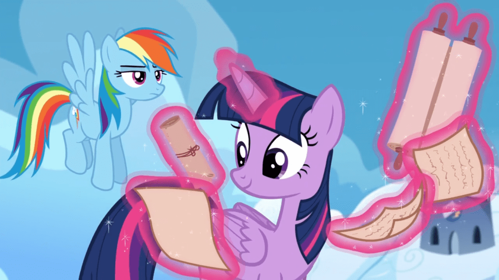 Twilight Sparkle: Thank goodness I had time to whip up a few charts on flight patterns and wing symmetry. It’s fresh in my mind from when I learned to fly. THIS IS SO EXCITING!