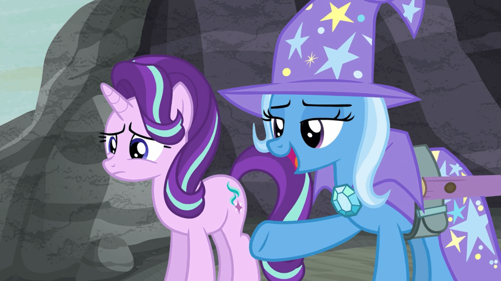 Trixie has a very, um… creative interpretation of friendship lessons. I think she purposely defies whatever goobery lessons Twilight likes to narrate and makes them into her own Trixie thing. Contrary to Twilight Sparkle’s worries, Trixie hasn’t pushed Starlight into becoming more self-absorbed—Twilight’s metaphorical daughter has enough self-awareness to retain her own values.