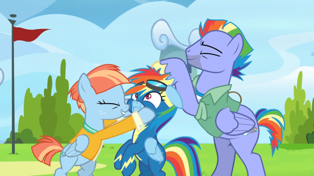 This last scene shows that Rainbow Dash’s parents have finally gained self-awareness on how they’ve been treating their child. It also shows that Rainbow Dash can be over-the-top affectionate when she wants to be, just like her parents. We’ve already seen her act this way with Tank, and on occasion Scootaloo.