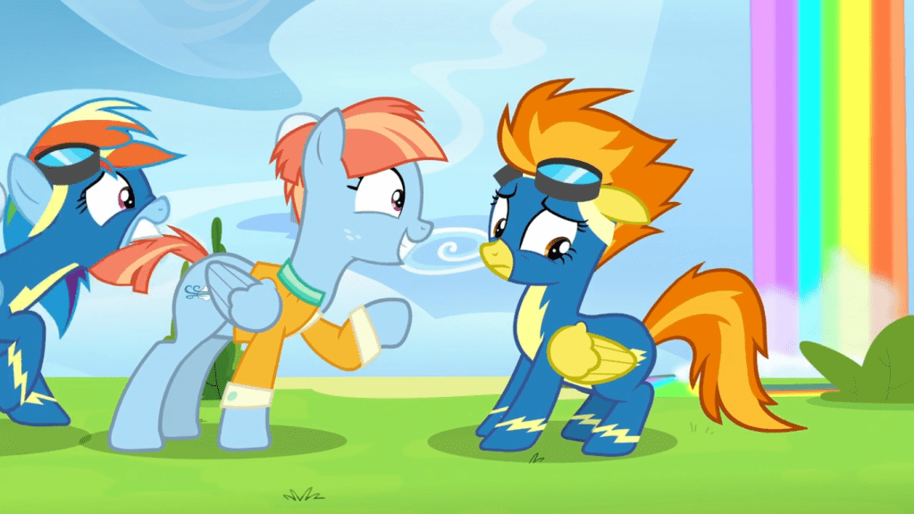 Here’s a flashback with three supporting characters I have something to say about. I’ll start with Spitfire; Lightning Dust and Derpy Hooves will have to wait.