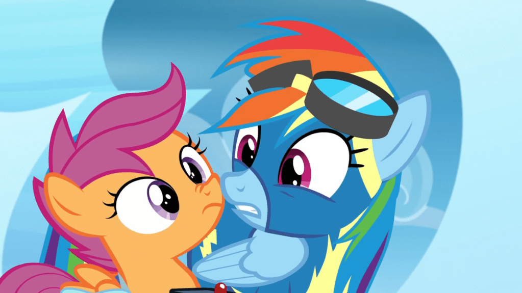Scootaloo and Rainbow Dash are interesting because unlike the other two Cutie Mark Crusader sibling pairs, the younger sibling is often the voice of reason. Maybe this is because they aren’t biological sisters, so Scootaloo views Rainbow Dash as more of a role model than an authority figure. The phrase “you should have warned me” shows that Rainbow Dash hasn’t outgrown the slightly antagonistic way a child sees their parents. She claims she and her parents are very close, but that’s a lie. They’ve never been more distant in their lives.